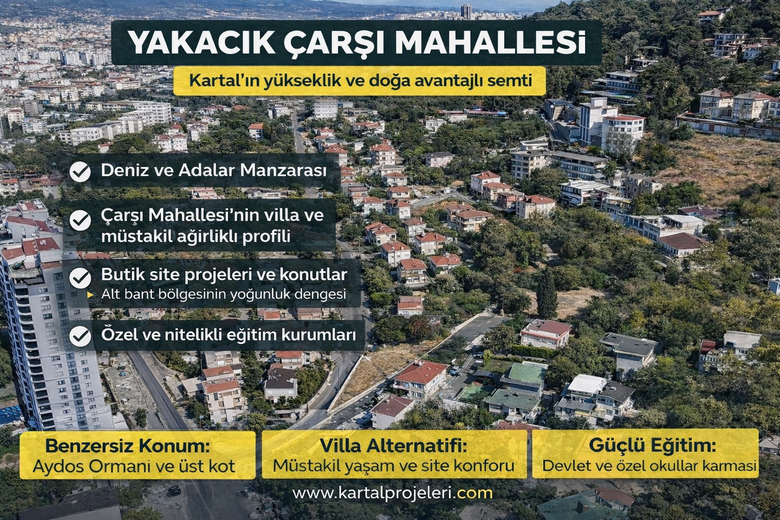 Kartal’ın en köklü yerleşimlerinden biri olan Kartal Yakacık Çarşı Mahallesi, Aydos Ormanı ile iç içe konumu, yüksek kotlu yerleşimi ve temiz hava karakteriyle ilçenin sahil bandından farklı bir yaşam alternatifi sunar. Mahalle; doğa, manzara ve yerleşik komşuluk kültürünü aynı potada buluşturur.